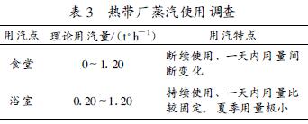熱帶廠蒸汽使用量從一天的時(shí)間段來看,存在著用量大小變化大、短時(shí)間集中用汽、大部分時(shí)間用汽小而均勻的特點(diǎn)。按季節(jié)來看,冬季的用汽量要明顯大于夏季。表3對(duì)熱帶廠的蒸汽使用情況作了簡(jiǎn)單分析。