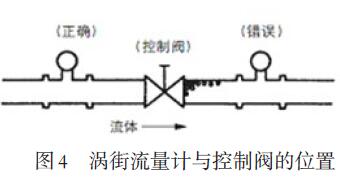 控制閥應(yīng)安裝在渦街流量計的下游,這樣可解決液體流過控制閥時,因壓力下降而產(chǎn)生氣泡的不良影響,見圖4。渦街流量計安裝于水平管道時,當被測介質(zhì)溫度大于200℃時,變送器一定要表頭向下安裝。