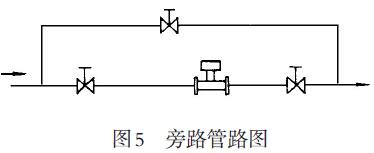 為了方便地檢查和清洗流量計(漩渦發(fā)生體),安裝如圖5所示的旁通管道。對于初次投運或管線設(shè)備檢修后,開車時應(yīng)先使工藝介質(zhì)走旁路24小時,待介質(zhì)干凈時開表,以防變送器被異物阻塞或變送探測器被損壞。
