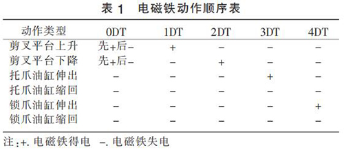 改進后液壓系統(tǒng)工作原理:通過溢流閥調(diào)整剪叉油缸工況所需壓力,通過疊加溢流閥來調(diào)整托爪和鎖爪工況所需壓力。 剪叉平臺上升(剪叉油缸縮回)或下降(剪叉油缸伸出)時 0DT 先得電,當(dāng)剪叉油缸到位后 0DT 失電,大泵供油無壓流回油箱。 通過電磁換向閥 17(1DT 和 2DT 的得失電)來控制剪叉油缸的伸出或縮回,通過電磁換向閥 18(3DT 和4DT 的得失電)來控制托爪和鎖爪的伸出和縮回。改進后液壓系統(tǒng)的電磁鐵動作順序如表 1 所示。