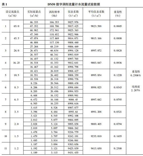 將本文實現(xiàn)的數(shù)字飽和蒸汽計量表在上述 50mm 口 徑( 簡稱 DN50) 的水流量試驗裝置上進行試驗。先在其正常流量范圍內(nèi)進行試驗,流量從大到小逐漸降低,之后不斷探求其所能測量的*小流量。每個流量點試驗三次,計算其重復性、平均儀表系數(shù)和線性度。水流量試驗數(shù)據(jù)如表 1 所示。