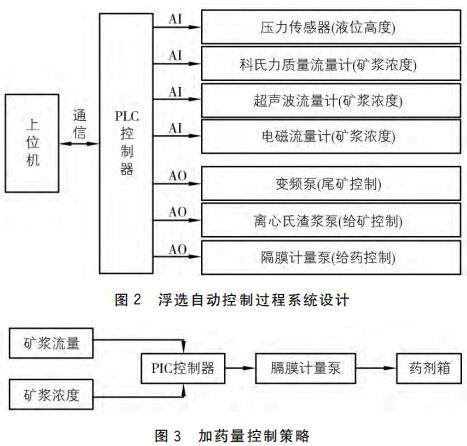 圖3中的礦漿流量與礦漿濃度分別由科氏質(zhì)量流量計(jì)和超聲波流量計(jì)測得,并 以4~20mA 電流信號傳送給 PLC控制器。由 PLC控制器根據(jù)電流信號值計(jì)算出實(shí)際的礦漿濃度和礦漿流量值,對上述兩個值進(jìn)行邏輯處理以及運(yùn)算,得出實(shí)時(shí)加藥量。PLC 控制器將計(jì)算出的實(shí)時(shí)加藥量數(shù)據(jù)以4~20mA 的電流信號發(fā)送給隔膜計(jì)量泵,由其控制并實(shí)現(xiàn)加藥量過程的自動控制。