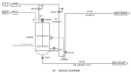通過(guò)以上煤漿提濃通用方法優(yōu)缺點(diǎn)比較可以了解到,在現(xiàn)有設(shè)計(jì)條件基礎(chǔ)上,煤漿濃度提升會(huì)帶來(lái)一定設(shè)備損耗及能源損耗。針對(duì)這種情況,為了達(dá)到節(jié)能而保證氯甲烷流量表不跑漿,對(duì)于磨機(jī)跑漿問(wèn)題進(jìn)行改善,對(duì)跑漿進(jìn)行回收,重新送回磨煤機(jī)進(jìn)行二次研磨,降低了氯甲烷流量表入口原料煤的粒度;同時(shí)降低了人員勞動(dòng)強(qiáng)度,改善了現(xiàn)場(chǎng)衛(wèi)生情況。具體跑漿回收裝置設(shè)計(jì)流程如圖 1 所示。