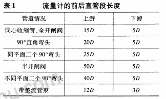 2)要求流量計(jì)的前后要有一定的直管段,直管段的長(zhǎng)度應(yīng)符合表1的要求(其中D為管道直徑)。在規(guī)定的直管段長(zhǎng)度內(nèi),管道入流段與出流段目測(cè)應(yīng)是平直的。為保證被測(cè)介質(zhì)滿管,流量計(jì)應(yīng)盡量避免安裝在調(diào)節(jié)閥、半開閘閥的下游。一般情況下不在擴(kuò)大管后安裝流量計(jì)。如果流量測(cè)量時(shí)需要進(jìn)行溫度或壓力補(bǔ)償時(shí),取壓點(diǎn)應(yīng)在流量計(jì)前l(fā)D以外,測(cè)溫點(diǎn)應(yīng)在流量計(jì)后5D以外。