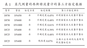 目前,國(guó)內(nèi)*三方標(biāo)定僅有開封**水大流量計(jì)量站能標(biāo)定口徑達(dá)1.6m的大管徑蒸汽流量計(jì),可以提供1.6m及以下全口徑檢定**。部分用于蒸汽測(cè)量的西斯特流量計(jì)的*三方檢定數(shù)據(jù)如表1所示。