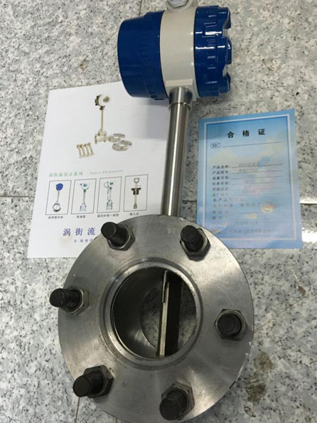渦街流量計由法蘭卡裝式流量傳感器和顯示儀表組成。法蘭卡裝式流量計將專用法蘭焊接在工藝管道上,然后用螺栓、螺母將儀表固定在兩個法蘭之間。安裝簡單便捷,成本低。本公司提供專用法蘭,不需另行購買安裝法蘭。