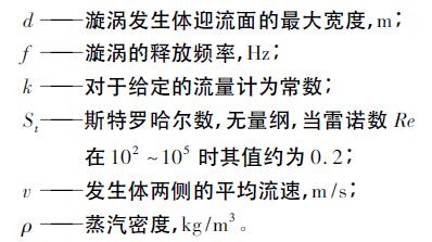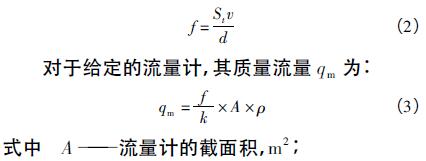 流體流經(jīng)設(shè)置在管道內(nèi)的漩渦發(fā)生體時(shí)會(huì)產(chǎn)生流動(dòng)振蕩,在發(fā)生體的兩側(cè)交替產(chǎn)生規(guī)則漩渦,測(cè)定其振蕩頻率可以反應(yīng)流量的大小。當(dāng)工況條件合適時(shí),漩渦頻率f和流體速度v成線性關(guān)系,且與密度無(wú)關(guān),可表示為: