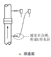用差壓流量計(jì)測(cè)量蒸汽流量,為保護(hù)差壓變送器的高低壓室,通常設(shè)置兩個(gè)冷凝罐,兩個(gè)冷凝罐內(nèi)液位高度相等是壓差信號(hào)不失真?zhèn)鬟f的關(guān)鍵。如果發(fā)現(xiàn)一個(gè)冷凝罐是冷的,罐的上部必定不是蒸汽,造成這種情況的原因有多種,如:導(dǎo)壓管堵、根部閥堵、溢流口高度比取壓口低、在取壓口和冷凝罐之間存在液封等。不管是哪種原因,都將使差壓變送器接收到的壓差與節(jié)流件送出的壓差信號(hào)不相等,進(jìn)而引起流量測(cè)量誤差。如圖1所示,改造前到正壓冷凝罐的引壓管由于安裝坡度不合理形成U形水封,這段管內(nèi)的冷凝水不能靠重力流回母管,從而造成流量示值偏低。配置和安裝合理的壓差裝置后,蒸汽從母管經(jīng)導(dǎo)壓管流入冷凝罐,放出熱量后變成凝結(jié)水,罐中液位高于溢流口后自動(dòng)返回母管,從而保證兩個(gè)罐中的凝結(jié)水液位相等。